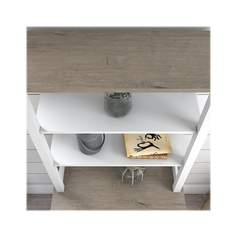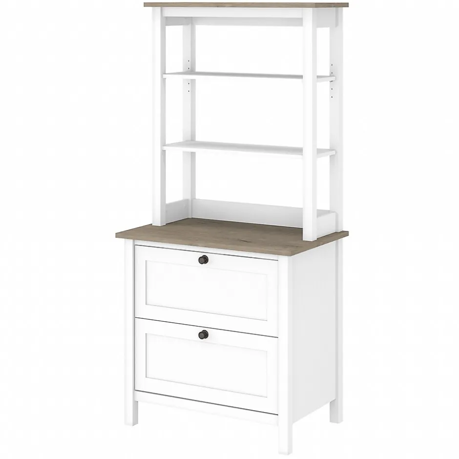 The Bush Furniture Mayfield bookcase with drawers combines casual looks with a practical design that makes organizing books and paperwork easy. Keep paperwork in order while showing off your favorite books, pictures and decorations with storage that suits your casual home. Highlighted by its relaxed modern farmhouse style, the Bush Furniture Mayfield bookcase with drawers makes a great addition to virtually any living space. Two file drawers open on smooth full-extension ball bearing slides for an effortless reach to legal, letter and A4-size documents. A hutch attaches to the top of the filing cabinet to add an open storage area with one fixed shelf for stability and one shelf that can be raised or lowered to accommodate items of various sizes. Each shelf supports up to 25 pounds, so you can store your collection of paperback and hardcover books or display larger decorations with confidence. This bookcase with drawers is tested to meet ANSI/SOHO standards for safety and performance and is backed by a 1-year warranty.