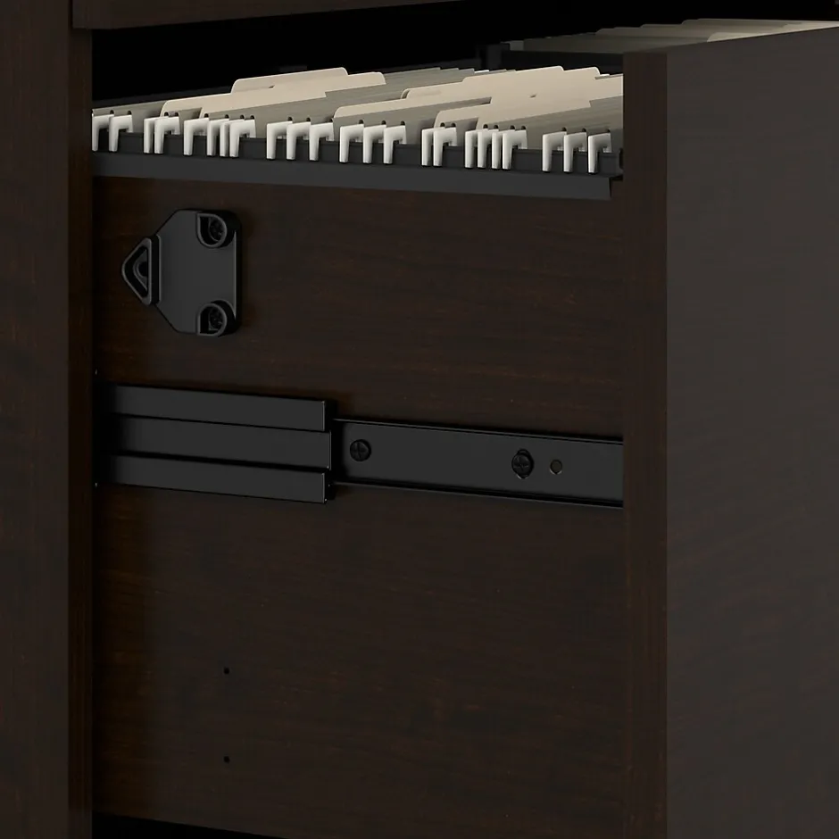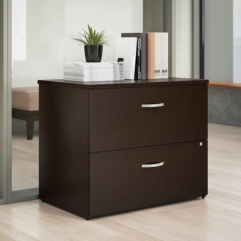 Bush Business Furniture’s Office in an Hour Collection is an ideal solution for converting empty space into a practical and productive work environment. Designed with convenience in mind, this 2 Drawer Lateral File Cabinet arrives fully assembled so you can enjoy an organized workspace instantly. The filing cabinet’s two spacious drawers open on smooth full-extension ball bearing slides for an effortless reach to letter, legal, and A4-size paperwork. A single lock secures both drawers to protect documents with sensitive information as well as personal items you want kept tucked away. The surface of the 2 Drawer File Cabinet can serve as a small printer stand or laptop charging station and can also be used to display decorations. This locking file cabinet has been meticulously tested to meet or exceed ANSI/BIFMA standards for safety and performance and is backed by a 10 Year Warranty.