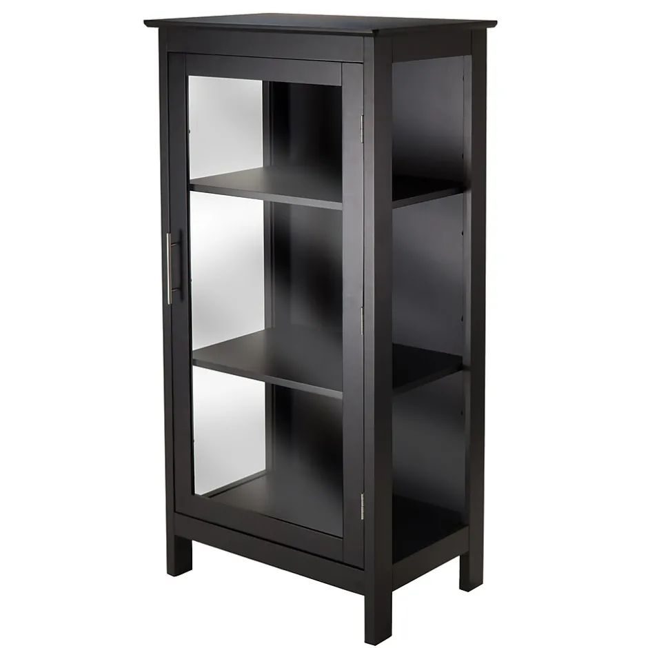 The Poppy Display Cabinet features tempered glass on three sides for easy viewing. Cabinet has three shelves; the top shelf is adjustable. Made of solid and composite wood in a sleek Black finish.