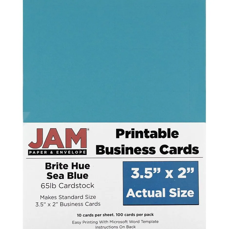 JAM Paper® Brite Hue Sea Blue Printable Business Cards are made of 30% recycled 65lb cardstock! These cards are sold in packs of 10 sheets with 10 cards, perforated along the edges, within each sheet for a total of 10 cards per pack. Each individual card measures 32.5 x 2 inches in size. The calming sea blue color of these cards is certain to appeal to the clientele of any business. These cards are completely blank and compatible with most home printers. Don’t run the risk of having ordered business cards arrive with errors or out of date information. Take control, and display you and your business in the way that you deem to be best by creating your own business cards!