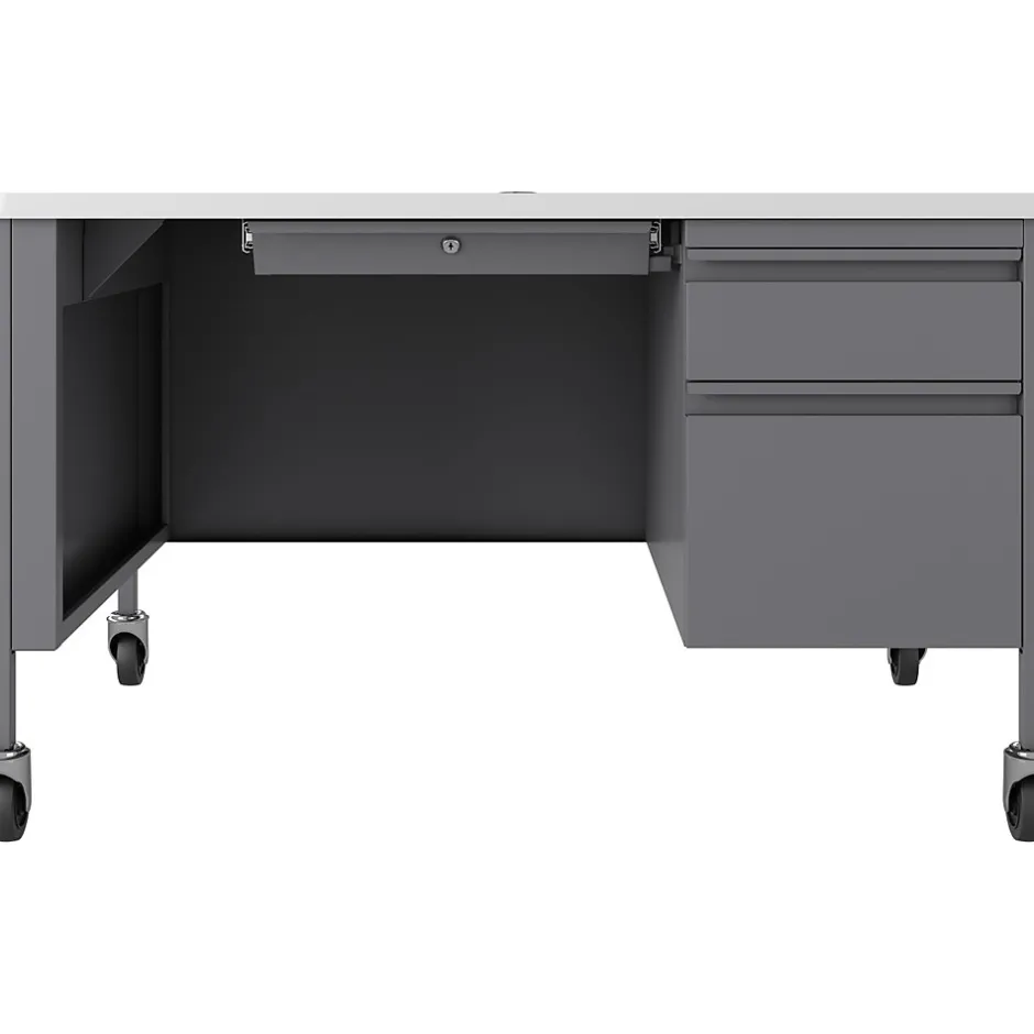 Single pedestal teachers desk that provides a practical desk solution to any educational environment. The T-mold edge promotes safety while the laminate provides a durable scratch and stain resistant surface that is easy to clean. Four casters add mobility and allow for easy classroom reconfiguration.