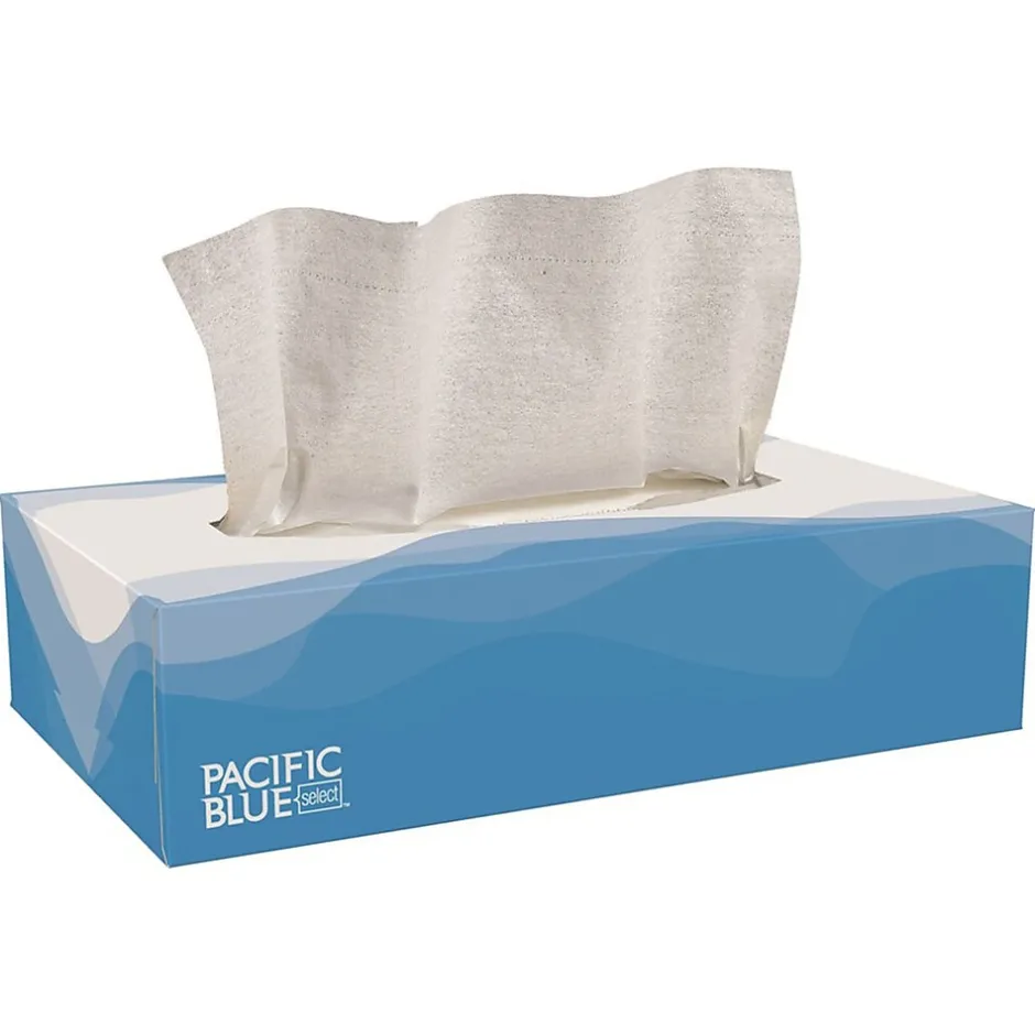 Pacific Blue Select flat-box 2-ply white facial tissues are soft to the touch, which makes blowing noses during cold, flu and allergy season more manageable. The 2-ply construction offers durability, making your purchase more cost-effective when employees or guests use fewer tissues. Individual boxes fit neatly on desktops for easy placement and they let you optimize your storage space. Color-coded tissues indicate when the box is close to being empty so your team knows when to get another one out of storage.