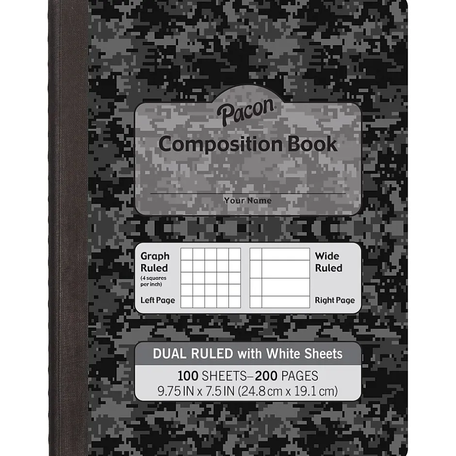 The PaconĀ® Dual Ruled Composition Books feature two alternating ruling styles. The right-hand page offers a 3/8″ wide ruling for traditional note taking and the left-hand page features a 1/4″ grid ruling to draw coordinating graphs, illustrations and interpretations. Note taking in this manner engages both hemispheres of the brain. These durable, hard cover, one-subject books feature a Dark Gray cover with White paper on the inside. Measures 9.75″ x 7.5″. Includes 100 Sheets (200 Pages) per book. Sold as a pack of 6 books.