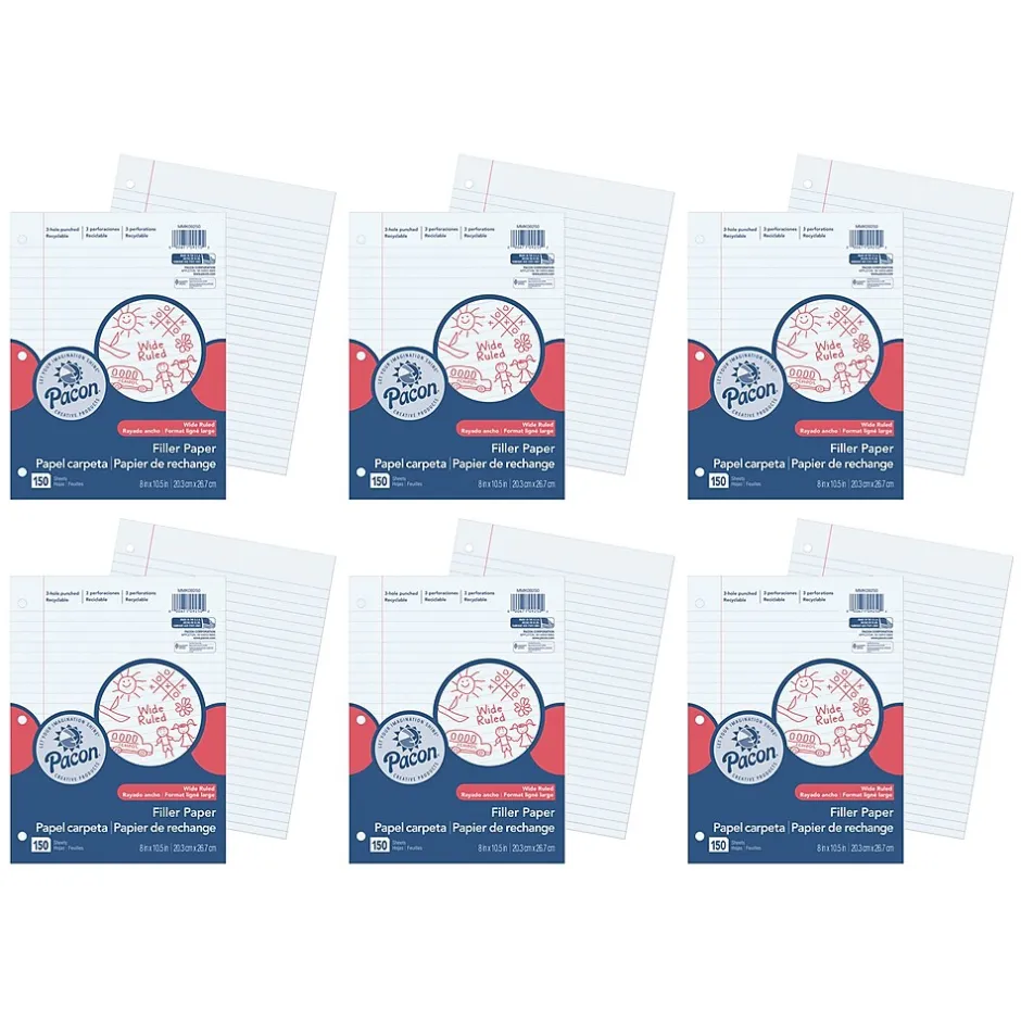 Pacon Wide Ruled Filler Paper, 8" x 10.5", 3-Hole Punched, 150 Sheets/Pack, 6 Packs/Bundle (PACMMK09250-6) Best