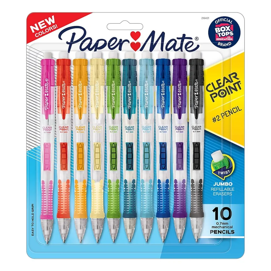 Paper Mate Clearpoint mechanical pencils have the feel of a pen and the look and performance of a pencil. These pencils feature bright, colorful barrels that create a fun writing experience. With a convenient side-click advance mechanism on the barrel, you’ll be able to load lead without losing your grasp.