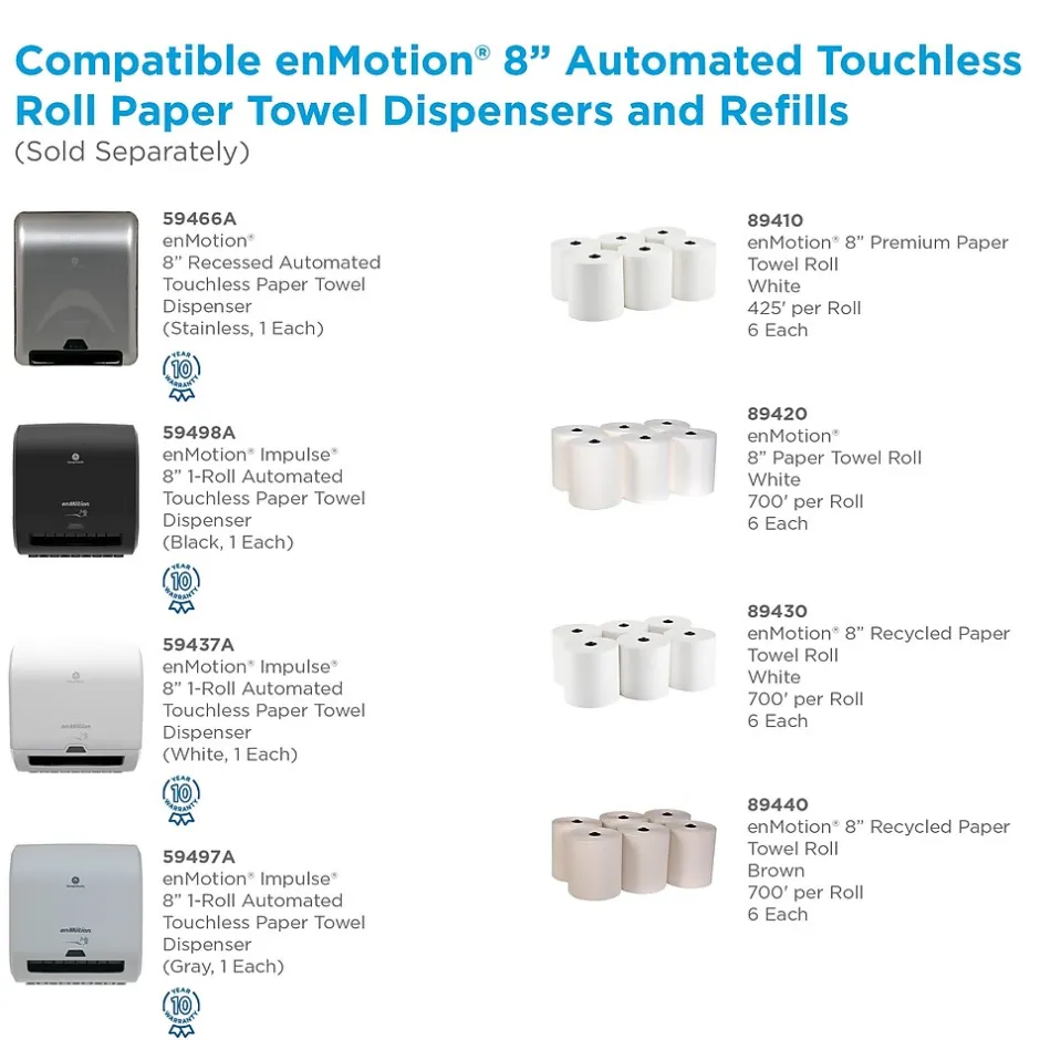 Fill up compatible dispensers with these paper towel rolls. One roll has 700 linear feet of paper for long-term use, and each pack has six rolls to keep your shelves stocked. These enmotion paper towel rolls work seamlessly with select enmotion dispensers for automated convenience.