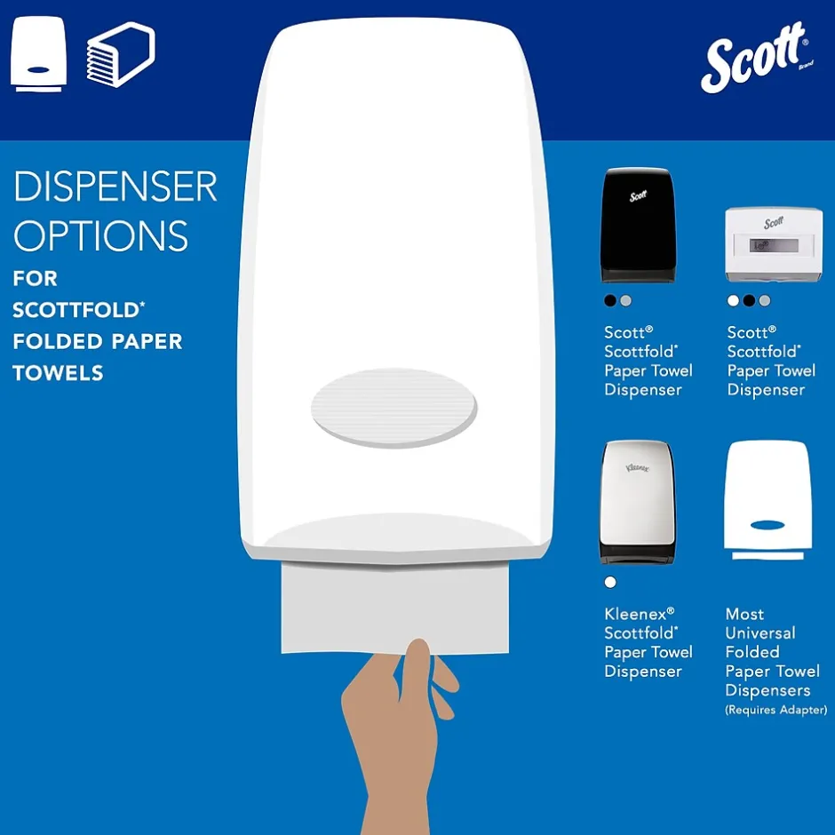 Keep these white paper towels in restrooms, kitchen areas, or near any shared sink. These towels feature Absorbency Pockets that soak up moisture quickly, and the material is soft for use on hands but strong enough to mop up spills. Designed to reduce waste, these multifold towels dispense one at a time, and they fit neatly into most universal dispensers. These Scott Scottfold paper towels are packaged as 175 towels in a pack with 25 packs per case, so you can supply multiple areas or stock up for future use.