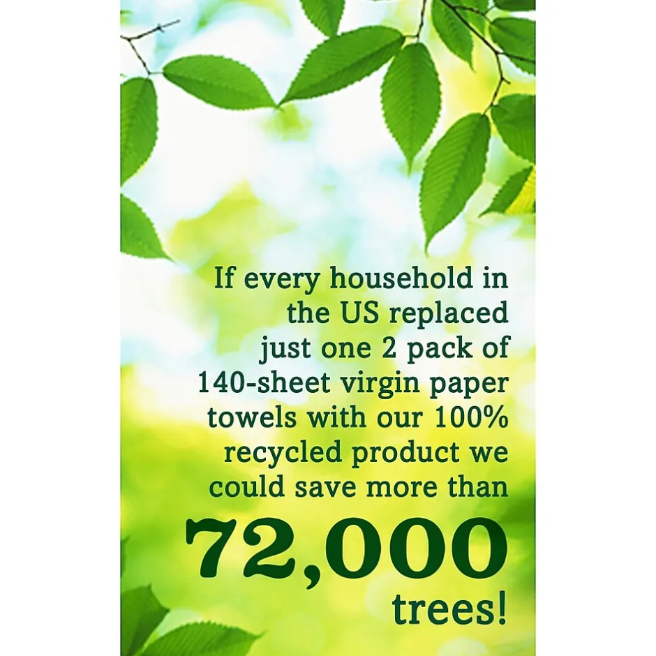 Natural, unbleached paper towels absorb spills quickly, even when wet, and helps you lessen your impact on the planet. High percentage of recycled content helps reduce the need for virgin wood pulp, which means more trees are left standing. Natural unbleached design with no dyes, inks or fragrances saves more natural resources compared to virgin or whitened recycled products by eliminating the whitening process, which saves water and energy. Unbleached pulp paper is made with a chlorine-free process and high percentage of post-consumer recycled content, and its unique color visually cues care for the environment in a way white paper cannot. The two-ply paper towels come in rolls that fit standard household, kitchen roll dispensers.