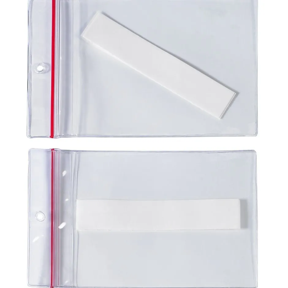 - Durable vinyl envelopes with adhesive backs for ease of use
