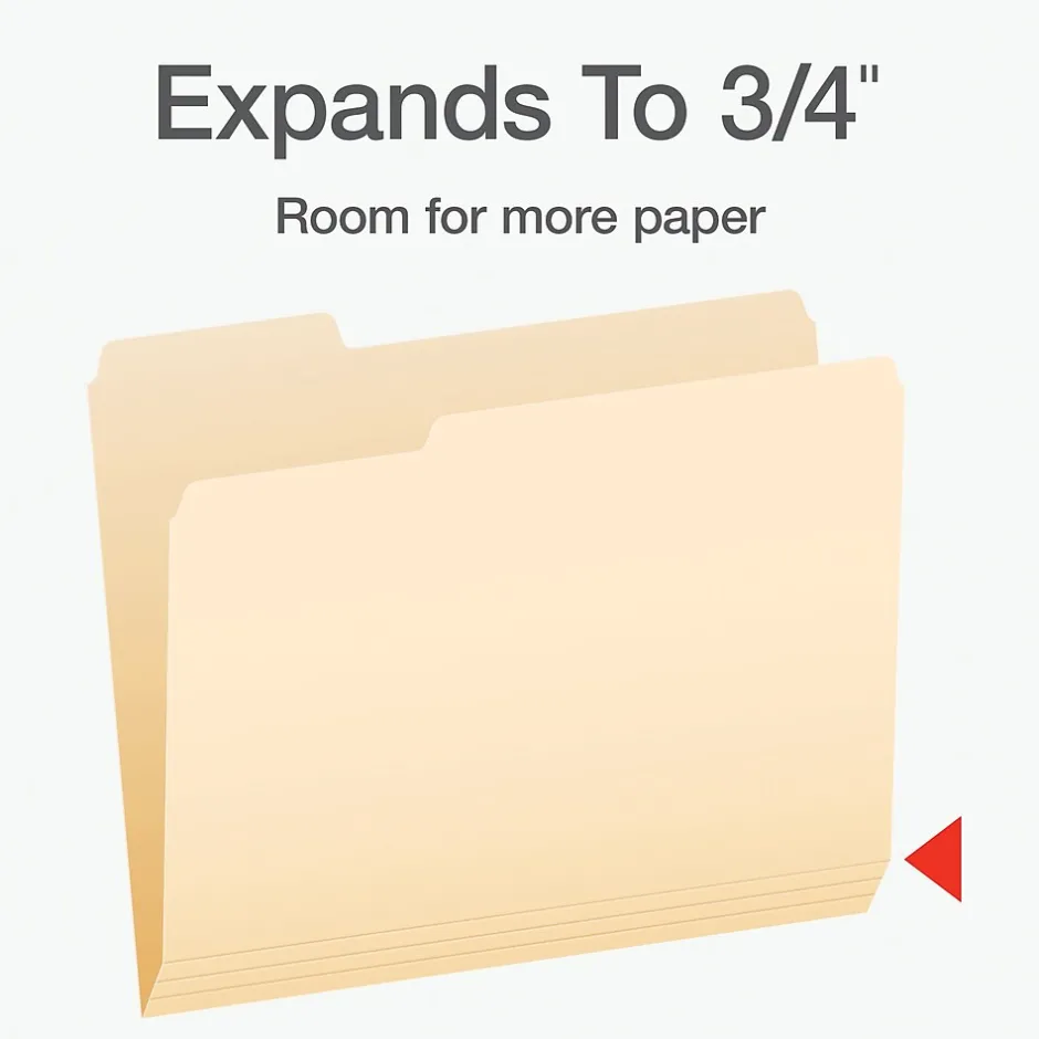 These Pendaflex File Folders are made from heavyweight 14 pt. paper to better withstand wear and tear. They come in a nice, neutral manila to match any home or office aesthetic. The 1/3 cut tabs come in 3 different positions (left, right, center), so you can see all of your labeled tabs in a file box or file drawer. Each folder fits letter-sized papers and is scored along the bottom for 3/4 inch expansion. Box of 100 manila file folders.