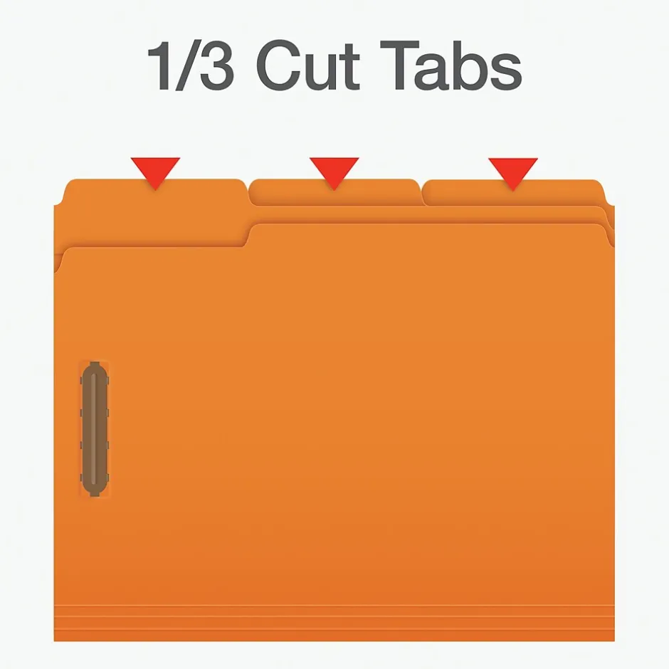 These Pendaflex Fastener Folders have thick, reinforced tabs that will better withstand wear and tear. Two embedded fasteners keep paperwork ordered and in place. The 1/3 cut tabs come in 3 different positions (left, right, center), so you can see all of your labeled tabs easily. Each folder fits letter-sized papers and is scored along the bottom for 3/4 inch expansion. Box of 50 orange fastener folders.