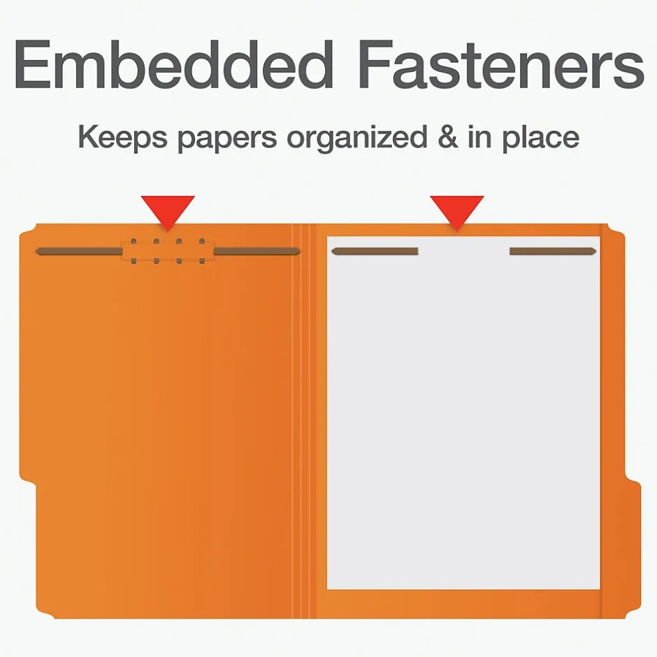 - These reinforced, orange fastener folders have two embedded fasteners to keep your papers in order and in place