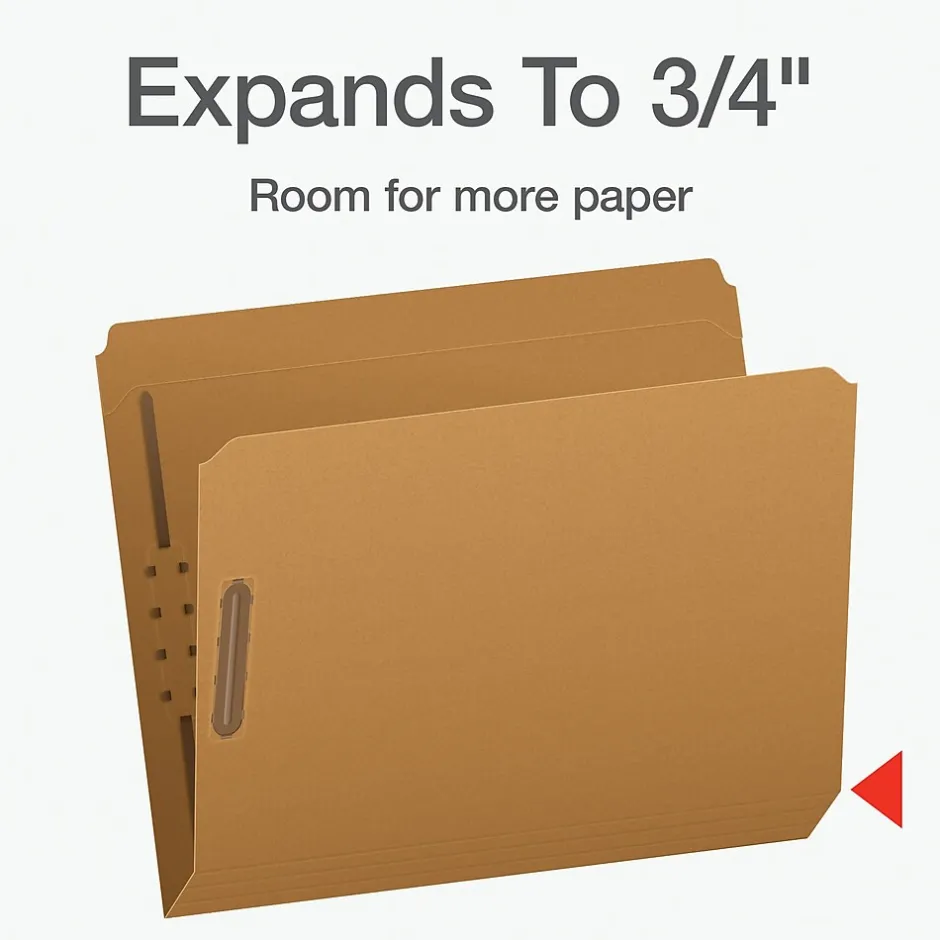 These Pendaflex Fastener Folders have thick, reinforced tabs that will better withstand wear and tear. Two embedded fasteners keep paperwork ordered and in place. The straight-cut tabs run along the top of the entire folder, giving you plenty of space for labeling. Each folder fits letter-sized papers and is scored along the bottom for 3/4 inch expansion. Box of 50 Kraft fastener folders.