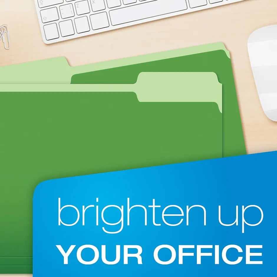 - Interior file folders with 1/3 cut top tabs in assorted positions that will not obscure hanging file tabs.