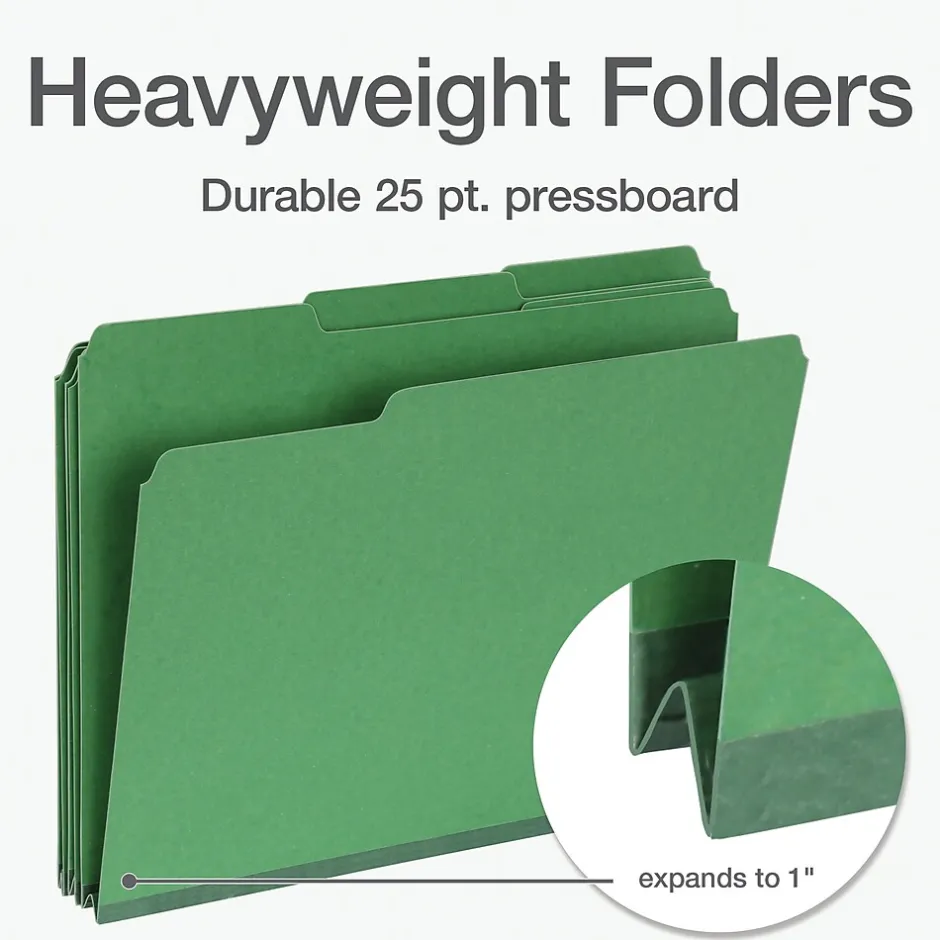 These Pendaflex File Folders are made from heavyweight 25 pt. pressboard to better withstand wear and tear. The 1/3 cut tabs come in 3 different positions (left, right, center), so you can see all of your labeled tabs in a file box or file drawer. Each folder fits letter-sized papers and is scored along the bottom for 1 inch expansion. Box of 25 green file folders.