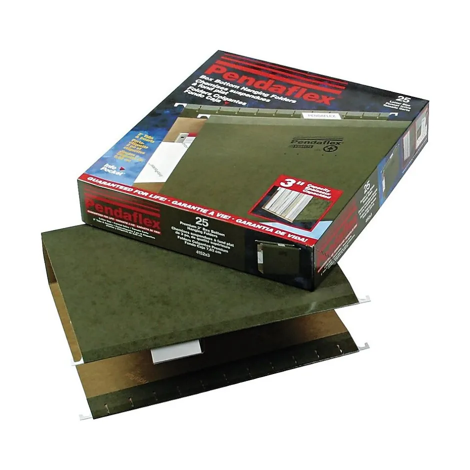 Organize documents with these hanging file folders. These folders feature special strips on their edges to guard against tearing. The interiors of these folders have a lighter color than their exteriors, which helps prevent documents from being misfiled. Each box of Pendaflex reinforced hanging file folders comes with a label sheet and tabs to help users separate their items.