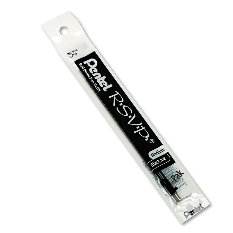 Pentel® Ballpoint refill in black ink features a clear barrel that allows you to see the amount of ink left. Refill with a medium 1.0 mm point tip is designed for Pentel® R.S.V.P. series and R.S.V.P. retractable series, sold as 2 per pack.