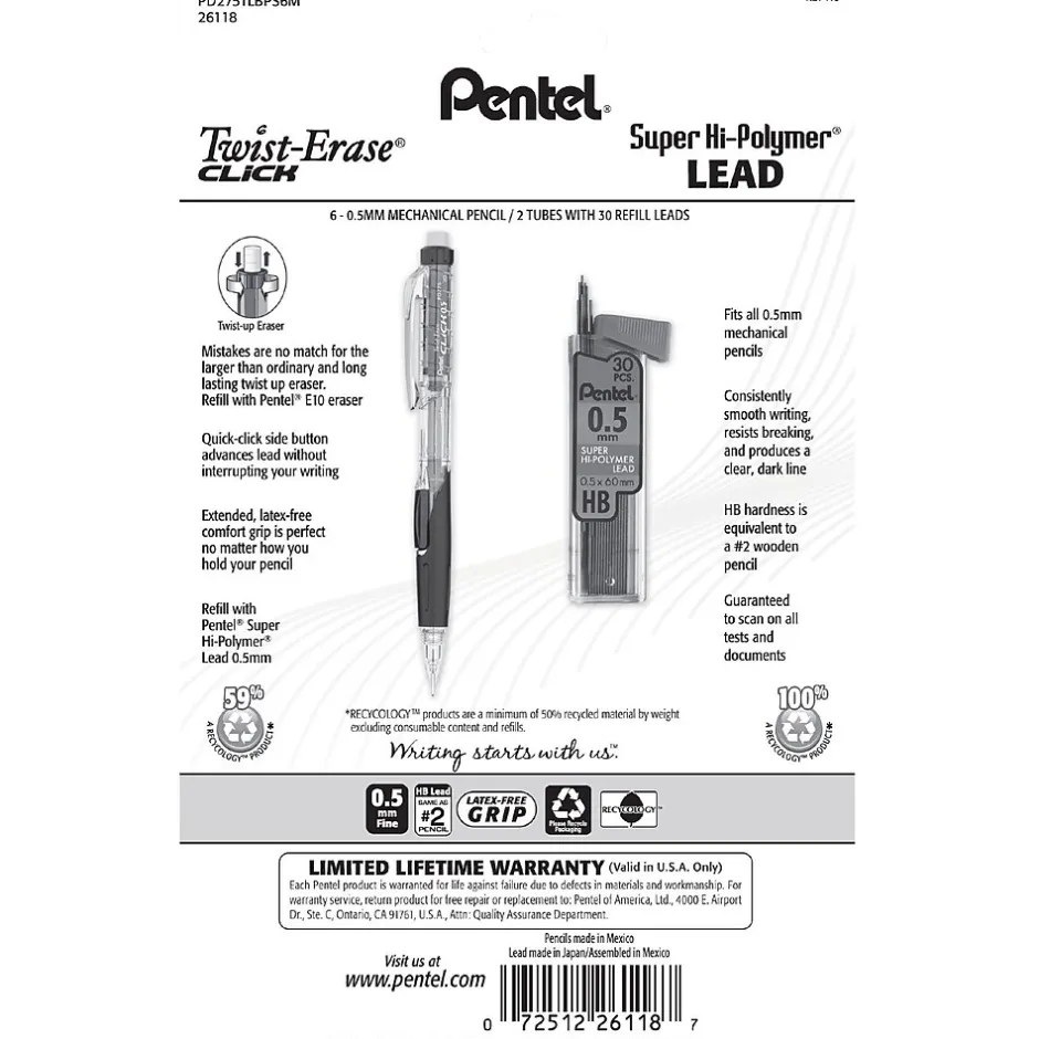 - The PentelĀ® Twist-EraseĀ® Click features new clear barrels with color accents.Quick-click side button advances lead without interrupting your writing. Larger-than-ordinary and long-lasting twist-up eraser. Latex-free grip. Pre-loaded with PentelĀ® Super Hi-PolymerĀ® HB lead that never needs sharpening and produces a clear dark line