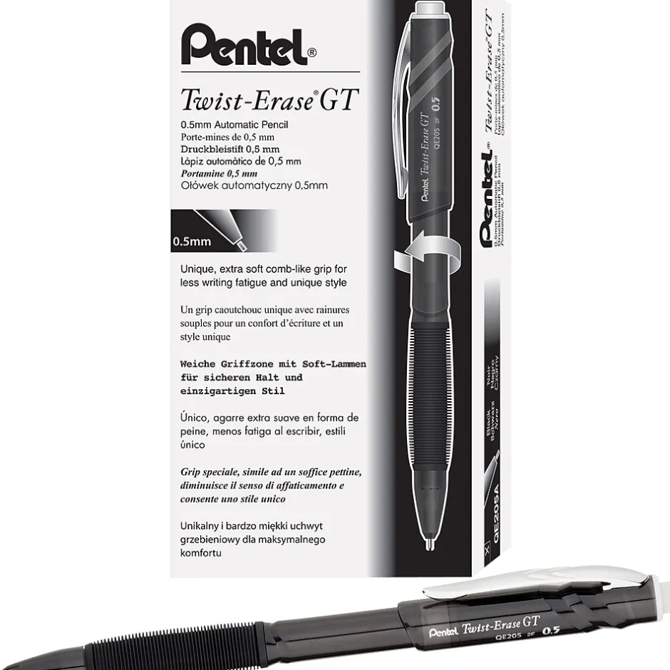 Take notes and correct errors effortlessly when you use the Pentel Twist Erase GT mechanical pencil. Designed with a distinctively ribbed, latex-free and soft grip, this mechanical pencil lets you write for hours while minimizing wrist strain. The sliding sleeve reduces the chances of lead breakage, so you can write uninterruptedly. Write consistent, fine lines thanks to this pencil’s thin yet durable lead. The sturdy metal clip doesn’t break easily, even when you repeatedly attach it to your shirt or backpack.