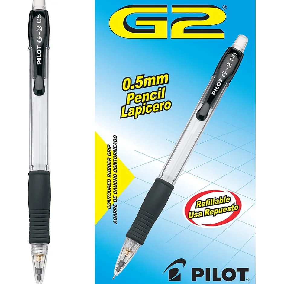 Get a smooth and comfortable writing experience by using these 0.5mm #2 mechanical pencils. Thanks to the attached plastic clips, these Pilot G2 mechanical pencils are easy to carry with you in a notebook or shirt pocket.