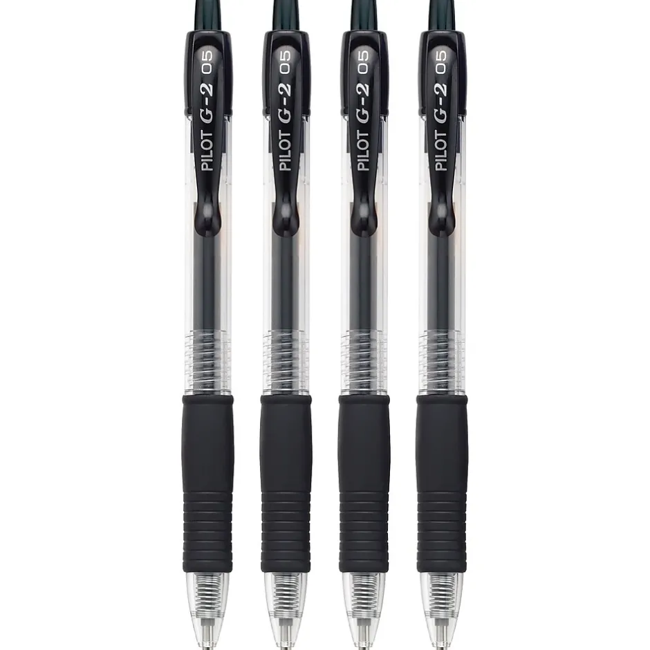 Keep this four-pack of Pilot retractable rolling ball pens on hand for a reliable option for drawing and most everyday writing tasks. Enjoy writing and drawing for longer periods of time with these reliably comfortable and smooth rolling ball pens. These extra-fine-point premium black ink gel pens feature an ergonomic rubber-coated grip, a clip, and a top-click design that conveniently coordinates with the ink color for easy identification.