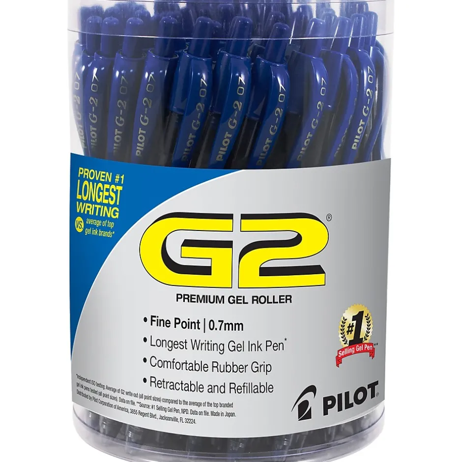 Enjoy clear, neat strokes with these premium retractable gel roller pens. Sold in a pack of 36 and with a convenient tub container, these pens make stocking up simple and can be stored away easily. These Pilot G2 fine-point blue pens feature a retractable design, so you can get started on writing tasks with a quick click and the ergonomic rubber-coated grip offers enhanced writing comfort.