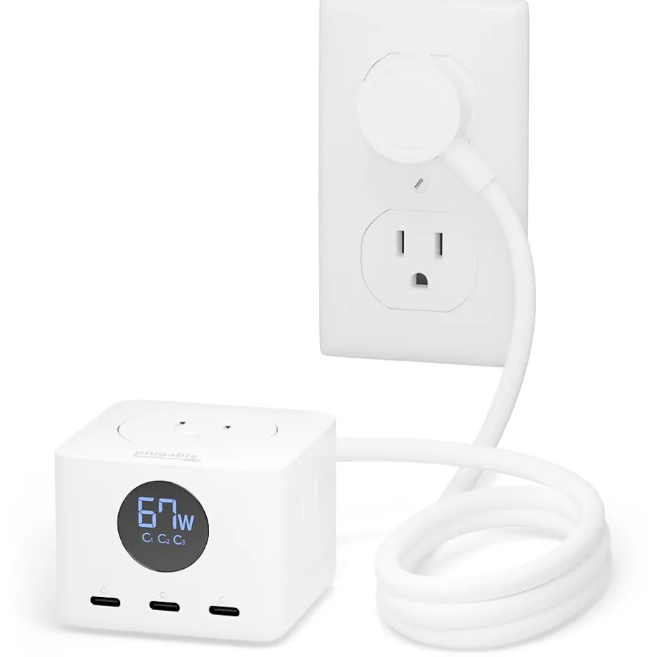 - Powerful charging – Charge everything with Plugable’s Triple Charging Station, an extension cord with multiple outlets. 3x USB-C ports with LED display, 3x power outlet, short circuit, overvoltage, and overcurrent protection. A right-angled AC plug, and a cable tie for convenience