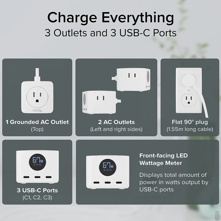 Meet the Plugable 67W Triple USB-C Charging Station (PS3-METER3), a versatile power solution with three USB-C ports providing up to 67W. An LED display shows power output, while three power outlets accommodate larger devices. The 1.55m cord with a right-angle plug ensures power is always accessible. Charge up to six devices at once, from earbuds to laptops, and keep cables organized with the hook-and-loop tie. Embrace the convenience and reliability of Plugable for all your charging needs.