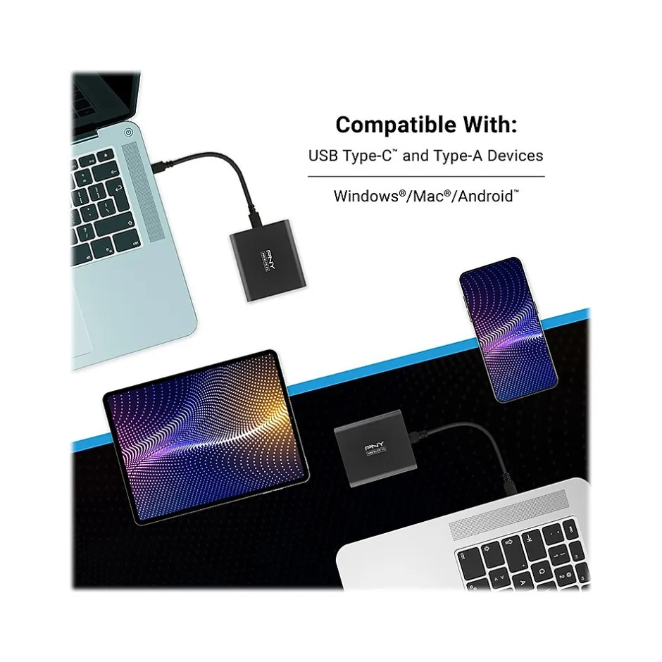 The PNY Pro Elite V2 portable SSD is the next generation in mobile storage, boasting not only increased storage capacity but also exceptional performance, with a USB 3.2 Gen 2 x 1 interface and read and write speeds up to 1100MB/s and 1000MB/s, respectively. This SSD is designed to be a mobile storage solution superior to previous generations of portable SSDs, as well as traditional USB 3.0 flash drives, allowing for even faster transfer and storage of files on the go. The Pro Elite V2 allows for expanded connectivity: access your data anytime, anywhere, from a vast array of host devices, both USB Type-A and USB Type-C enabled. The SSD comes with USB Type-C to USB Type-C and USB Type-C to USB Type-A cables, right in the box. What’s more, the included Acronis True Image data protection software easily backs up data. The Pro Elite V2 features a sleek aluminum design that fits comfortably in the palm of your hand, making it the perfect solution for life on the go.