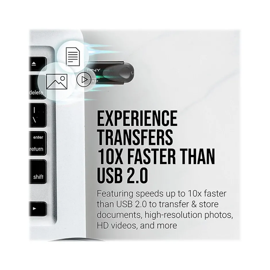 PNY’s Turbo Attache 4 USB 3.0 flash drive is built for speed and convenience. USB 3.0 offers the same ease of use and plug-and-play capabilities as previous generations of USB technologies, but with dramatic speed improvement, providing transfer speeds up to 10 times faster than USB 2.0. PNY’s Turbo Attache 4 USB 3.0 lightweight flash drive is designed with convenience and portability in mind, featuring a sliding collar design, which means no more lost caps. This USB 3.0 flash drive is small in size, but big on performance.