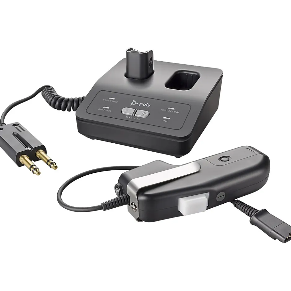 - Remote unit features: PTT button with momentary/locking selector, audio link On-Off button with LED, robust metal belt clip, receiving volume control, 12″ cable with Poly’s Quick Disconnect