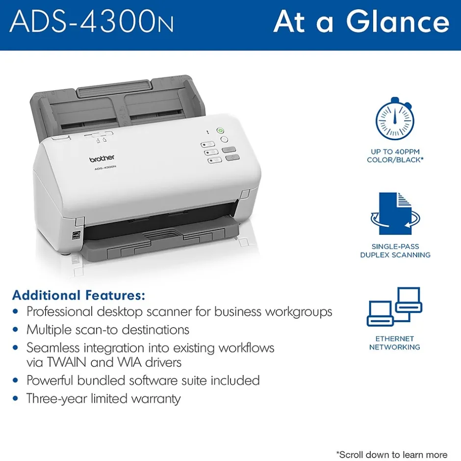 The Brother ADS-4300N professional desktop scanner with Ethernet connection is an essential component of an optimized fleet for the way work now works.