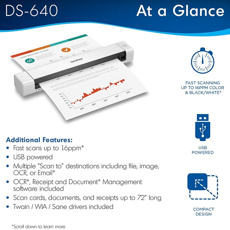 The Brother DS-640 mobile scanner is ideally suited for on-the-go/small office/home office professionals with its compact, mobile design and simple workflow applications. The compact size and portability of the DS-640 combined with its fast scan speeds and image-optimization features make it a perfect fit to be used on the road or to be used in the home or small office, providing compatibility with the way you work. The DS-640 offers plug-and-play convenience. Use your laptop or PC to power the DS-640 by connecting the included Micro-USB 3.0 cable. The same connection allows you to seamlessly scan your hard-copy documents directly to your computer.