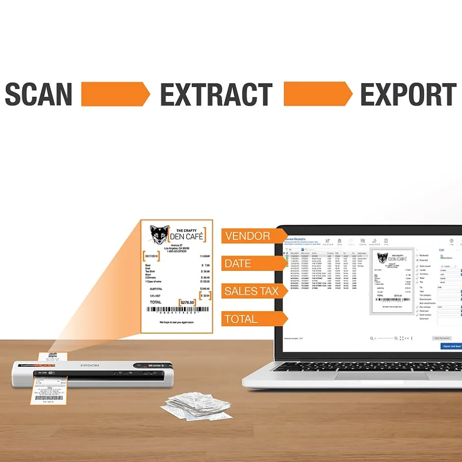 The fastest, smallest and lightest weight mobile single-sheet-fed document scanner in its class, powered by battery or USB, the Epson RapidReceipt RR-70W was specifically designed to quickly scan invoices and receipts of varying sizes, then automatically and accurately process the information into digital assets. With the included Epson ScanSmart financial software, you can turn unorganized receipts and invoices into categorized digital data that easily integrates into applications such as QuickBooks, TurboTax and more. Plus, create searchable/editable PDFs with the included bonus software. Do it all with zero subscription fees. It’s all done on your own device, giving you complete control over your data, where it’s stored and how it is used. It’s the easy, cost effective way to organize and manage your finances.