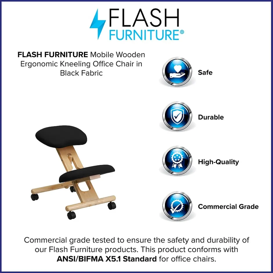Whether you work from home or go into the office, long workdays can take a toll on your body. This ergonomic kneeling chair is a trend setting option for people who want to support their body’s natural posture. It’s designed to strengthen your lower back muscles and help with spinal alignment. The firm, supportive padded seat and knee rests are filled with 2″ of foam and covered with breathable fabric. The height adjustable frame has a natural wood finish. Dual wheel casters make it easy to roll across the floor. This innovative chair helps to improve your posture, relieve back pain and give you more productive hours in the day.