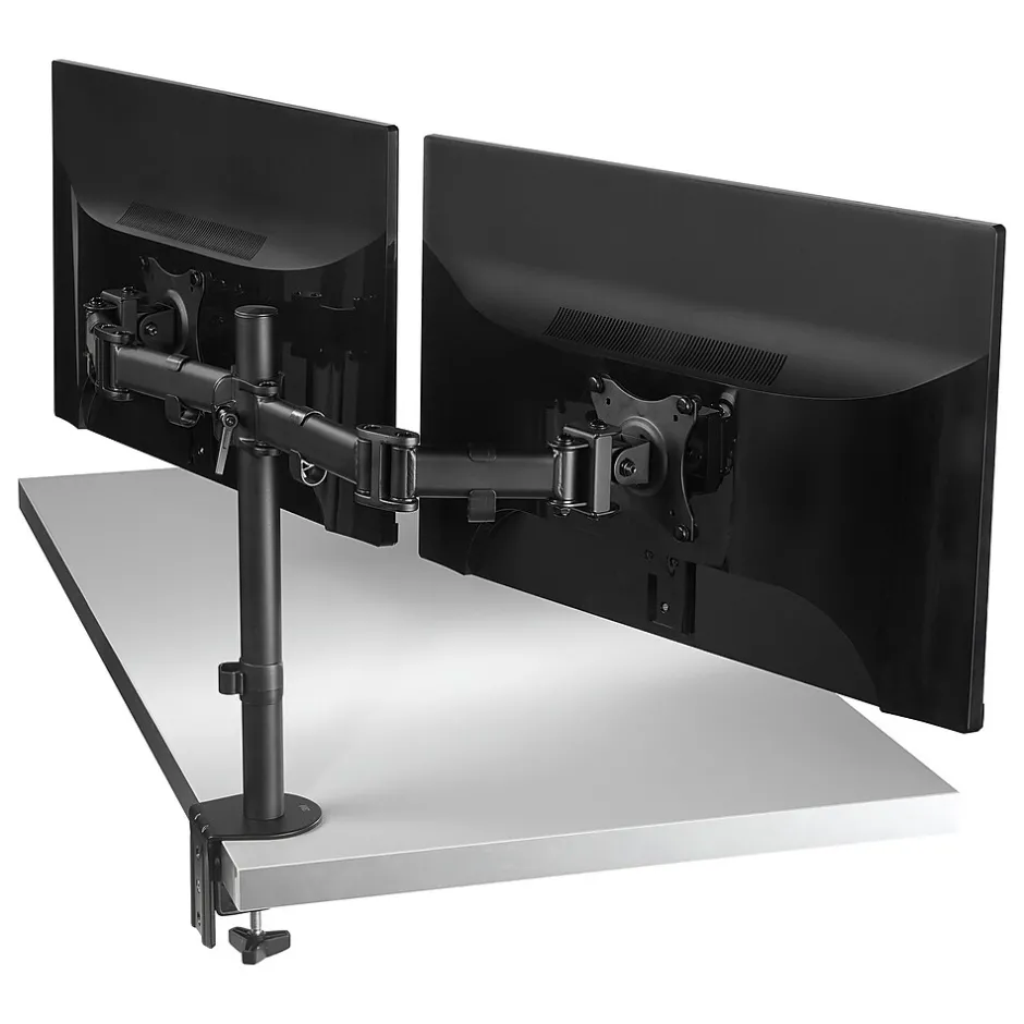 - Sturdy steel construction holds two monitors up to 28.5” W and 20 lbs. each, Black