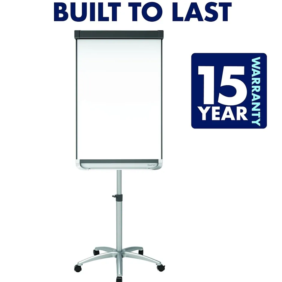 Mobile presentation easel has a magnetic Total Erase® whiteboard surface that doubles as a magnetic bulletin board, and includes a flipchart holder. Roll and relocate easel on 5-caster base with Prestige 2 Connects™ accessories attached. Easel adjusts from 67” to 77” tall. 15 year warranty.