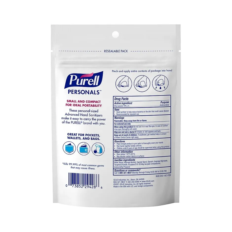 The Purell Personals portable gel hand sanitizer packet is ready in a pinch: an easy, compact way to sanitize your hands on the go.