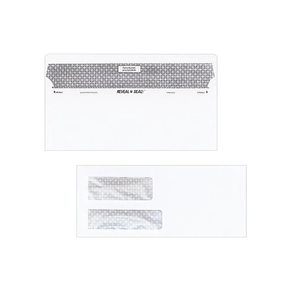 Give mailings a professional appearance with these double-window envelopes. The blue security tint shields sensitive information from view, while the two windows keep recipient and return addresses clearly visible. Self-sealing closures eliminate the need for moistening flaps before mailing. Packaged in a 500-count box, these Quality park Reveal-N-Seal envelopes provide an ample supply to meet the demands of busy offices.