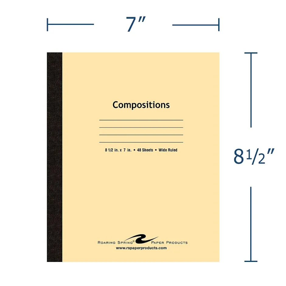 Paper is smooth 15 lb.writing paper with wide ruled blue lines. There is no margin line. Covers are a 7 pt. manila tag and are flexible to fit easily in backpacks. Each book is produced with center-sewn and tape bound construction, not designed for sheet tear-out. Sheet size is 8.5″ x 7″ and there are 48 sheets/96 pages per book.