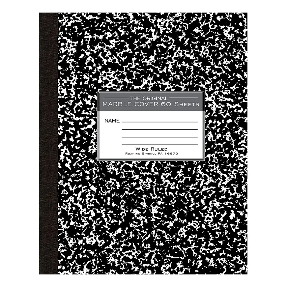 Record your notes in this black marble composition book. The flexible cover makes it easy to store this composition book in a backpack, while the sturdy backing provides a solid writing surface. This Roaring Spring Paper Products composition book has 60 sheets of 15 lb. paper and features a center-sewn, tape bound construction, so you don’t have to keep track of loose pages.