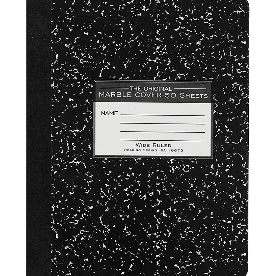 Record your notes in this permanently bound composition book. Paper is smooth 15 lb. writing paper with wide ruled blue lines and a red margin line. Covers are a hard white board that are printed in the traditional black marble pattern. Inside of covers is printed with class schedule and other useful information. Each book is produced with center-sewn and tape bound construction, not designed for sheet tear-out. Sheet size is 9.75″ x 7.5″ and there are 50 sheets per book. Proudly made in the USA!