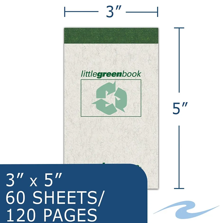 This handy little memo book has no wire and fits neatly in shirt pockets or pocketbooks. The smooth, white, 15 lb. recycled paper contains 30% post-consumer content and has narrow ruled lines. Covers are 20 pt grey mist recycled board. Each book is 3″ x 5″ and contains 60 sheets of writing paper. Each book is center sewn and tape bound along the 3″ (top) dimension.