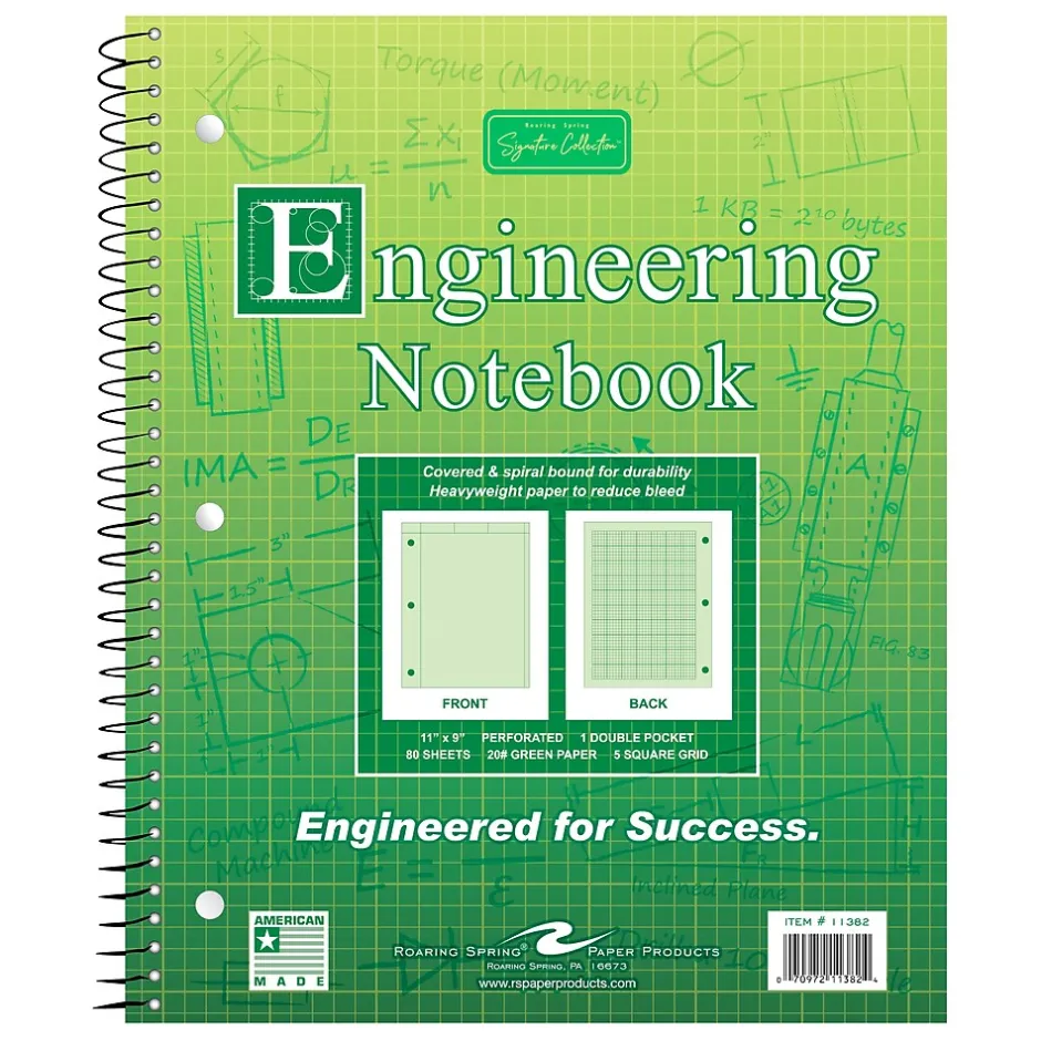 This Roaring Spring Paper Products notebook is excellant for use in engineering classes and labs. Smooth, green tint 20 lb. heavyweight writing paper is plain, except for the printed outline box on the top of the sheet, and has a 5″ x 5″ grid layout printed on the back of the sheet. The back grid shows through to front as dimensional guide for drawings and layouts. Three-hole punched to fit in standard three-ring binders. Sheet size is 8.5″ x 11″. 80 sheets per notebook. Oversize double pocket included under the cover. Proudly made in the USA.