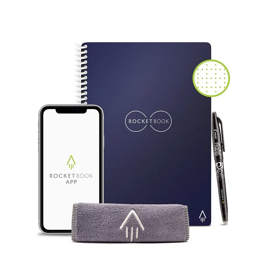 - Includes 1 Rocketbook Core Executive Size (6″ x 8.8″) Notebook, 1 Pilot Frixion Pen, and 1 Microfiber Cloth