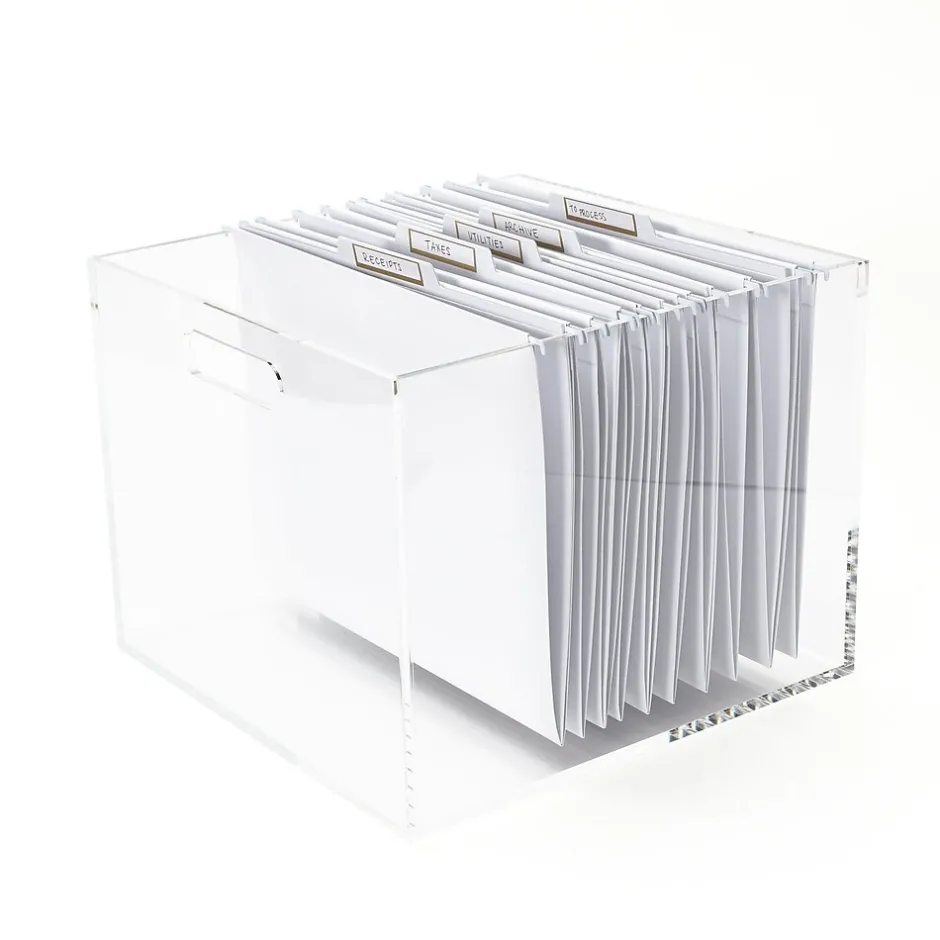 Create order and organization for your desk or shelves with the Russell+Hazel acrylic file box bundle. A tailored solution for your document storage, this file box keeps your space neat and tidy. Letter-size hanging file folders are easily accommodated with the 10″ height. Flawless, polished edges are durably constructed with built-in handles for mobility. Utilize this set to fill your space with structure, showcasing the energy you draw from your projects and work.