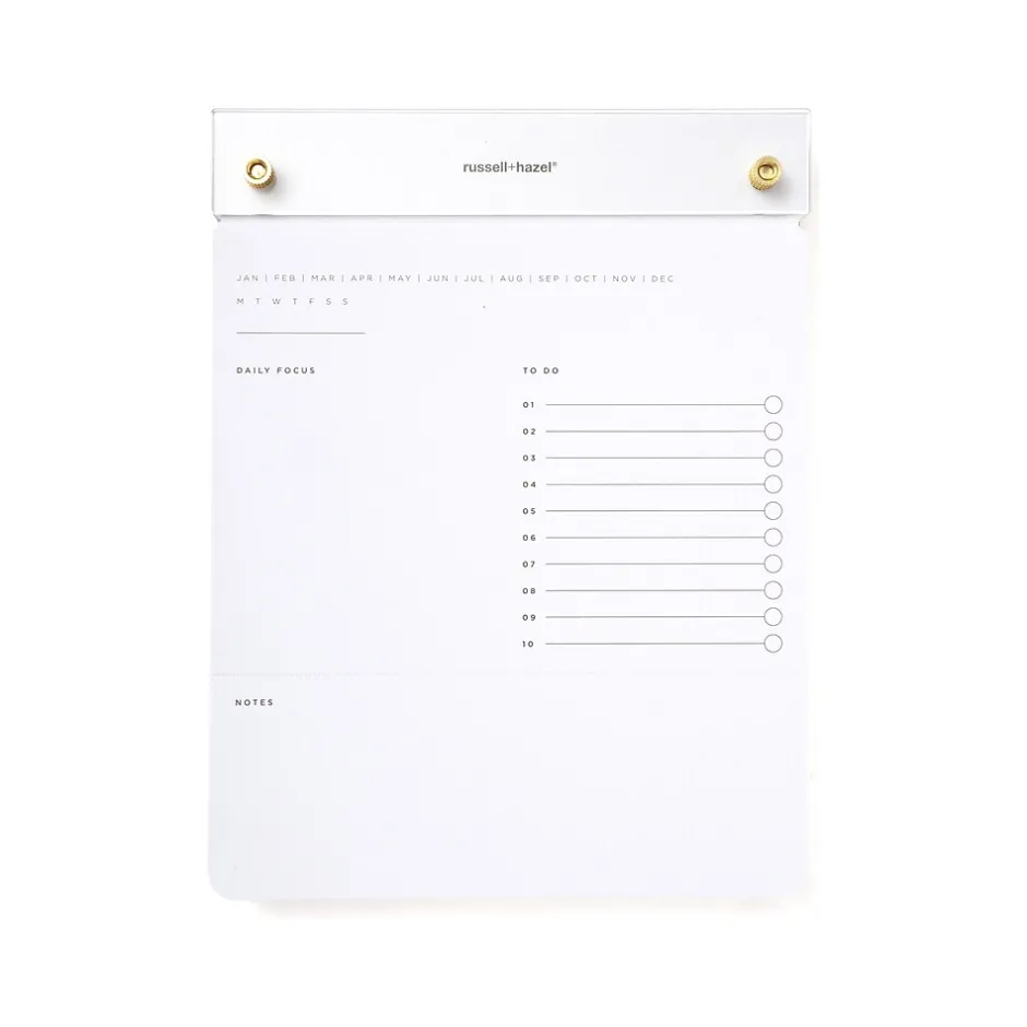 A new twist on this classic office accessory now with luxe gold detailing and acrylic backer. The Russell+Hazel acrylic drafter’s tablet features the iconic gold-toned hardware with a micro-perforated list paper pad. The 6.38″ x 8.44″ size of this notepad makes it the perfect desktop accessory to help you create and manage your daily to-dos. The paper pad is removable and held perfectly in place with delicate gold screws and it is refillable with the drafters tablet refills. Perfect for daily to-do lists, note taking, and planning.