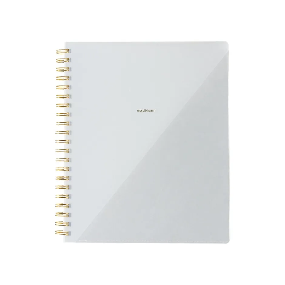 Understated sophistication with the Russell+Hazel signature spiral notebook. Features frosted front and back covers, gold-tone spiral binding, 196 ruled pages, and a bound pocket to keep any loose notes tidy. Pages include perforated edges for easy removal as well as space to note the date.