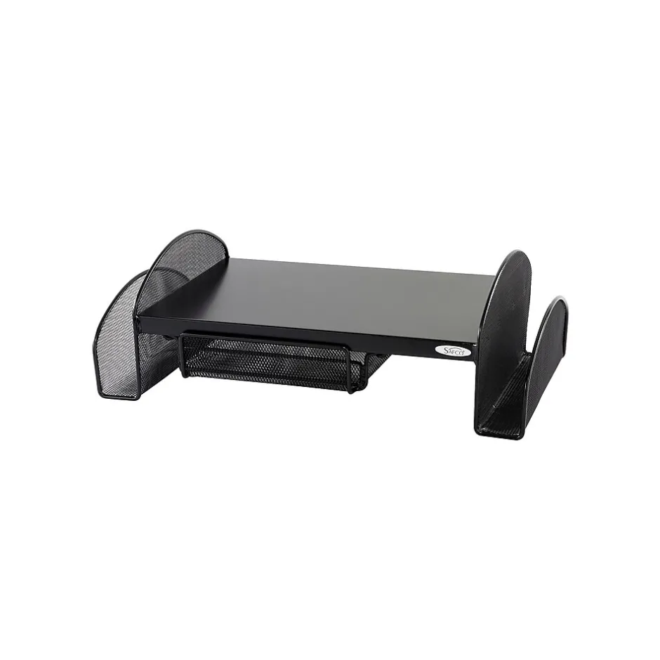 Raise monitors to the optimal viewing height with this stand. Organize supplies and papers in the two side compartments and sliding pullout drawer underneath this stand. This Safco Onyx monitor stand is constructed with heavy-duty steel mesh for quality and durability.