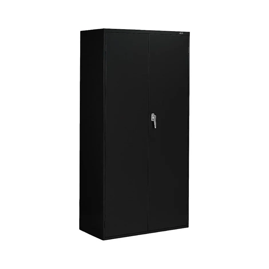 Lock expensive equipment inside this metal storage cabinet. It has three adjustable shelves and one fixed shelf, so you can customize it to your storage needs, and the built-in lock lets you secure items to prevent theft. It is 72 inches tall to save floor space, and the black finish imparts a sleek look. This Global 9300 steel storage cabinet is welded for durability.